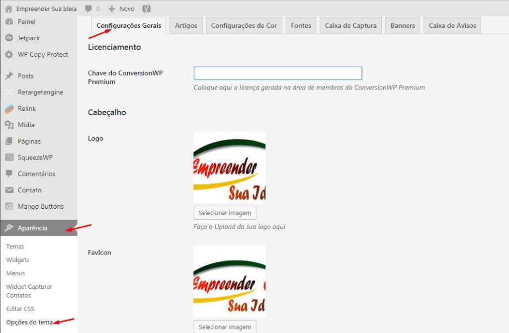 2º Passo – Dentro do painel do WordPress, você pode clicar em => Aparência => Opções do Tema.